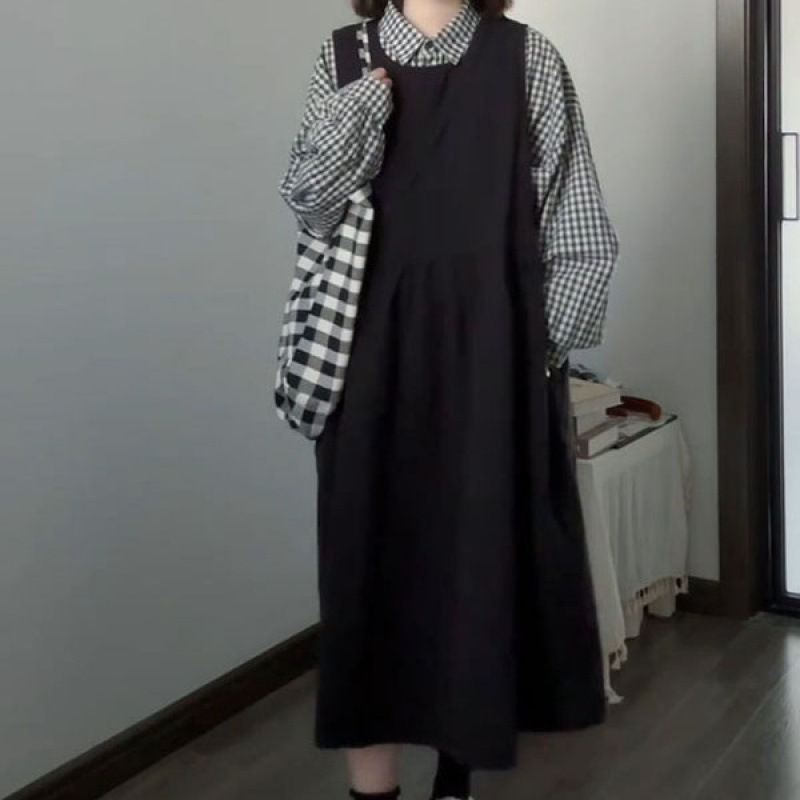 Gaun Bertali Longgar Sederhana Retro Gaya Kampus Versi Korea Kemeja Kotak-Kotak Wanita Setelan Dua Potong Musim Semi