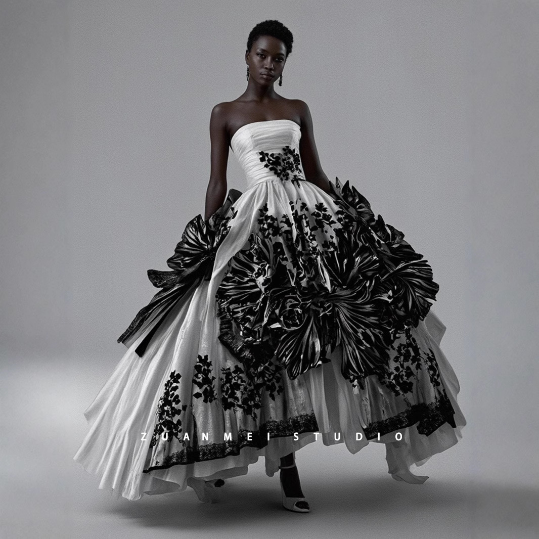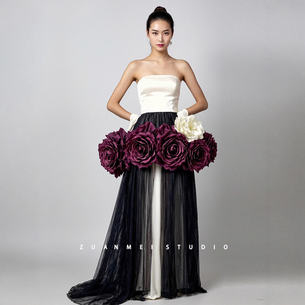 [Hubungi layanan pelanggan untuk mengubah harga diskon 30%] Desain gaun malam bunga mawar besar dengan warna hitam dan putih