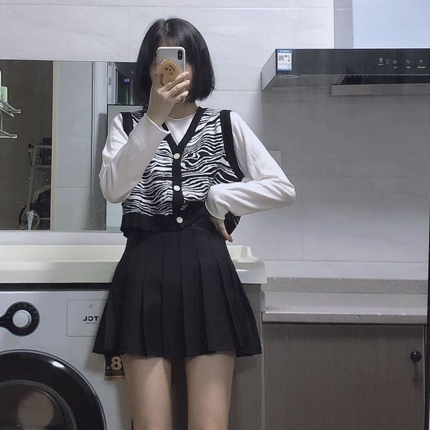 Setelan baju siswa musim semi gaya Korea Chic curling sweater lengan panjang + rompi pola zebra + rok lipit pinggang tinggi