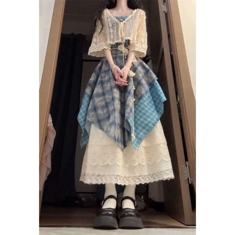Rok Sling Kotak-kotak Pinggang Jilid Dye Tidak Beraturan Retro Prancis Kardigan Pelindung Terik Matahari Murid Perempuan Set Dua Potong