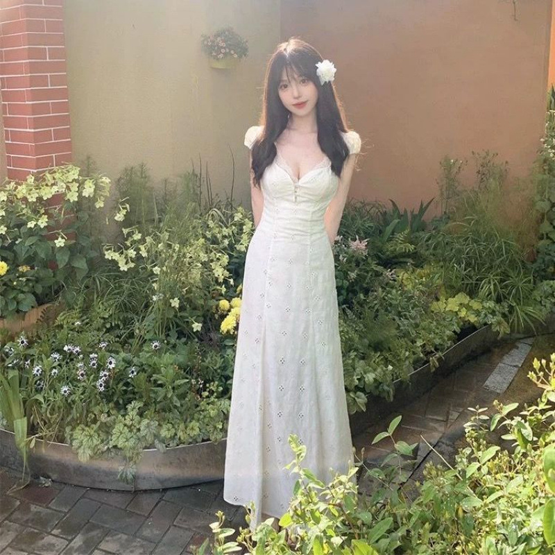 Gaun Renda Berongga Pinggang Lembut Murid Musim Panas Model Baru Manis Retro Gaya Perancis Gaun Panjang Elegan Desain