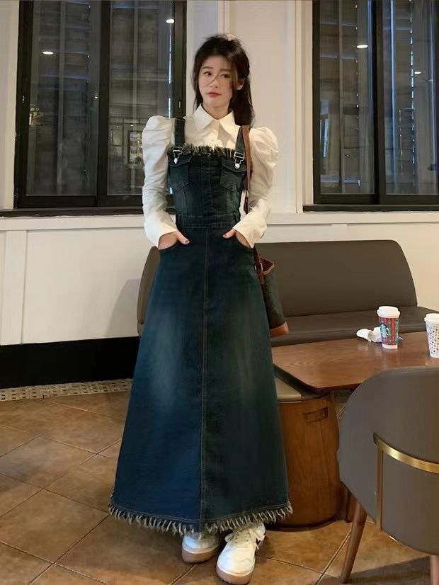 Setelan Dua Potong Gaun Tali Tali Denim Tua Dicuci Air Pinggang Modis Gaya Hong Kong Retro Kemeja Putih Pelajar Perempuan