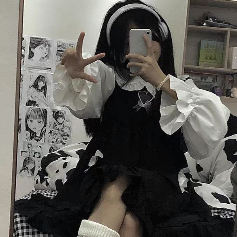 Setelan Rok Tali Lucu Gadis Gaya Jepang Kemeja Kerah Boneka Longgar Manis Pelajar Perempuan Gaun Pita Kupu-Kupu