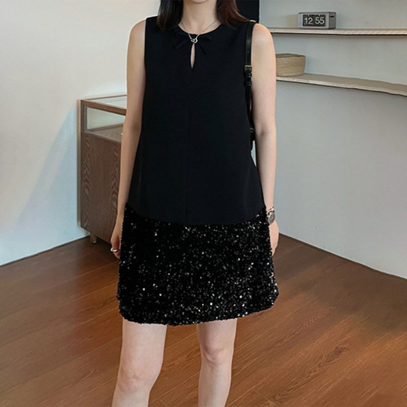 Gaun tank hitam bergaya Chanel kelas atas musim panas Nanyou 2025 untuk wanita, gaun tanpa lengan elegan dengan patchwork payet