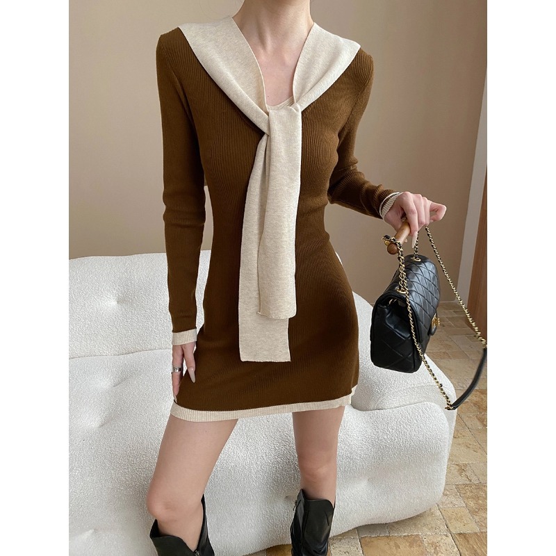 司南 时髦精挚爱 法式气质撞色假两件披肩V领针织连衣裙 SN8001