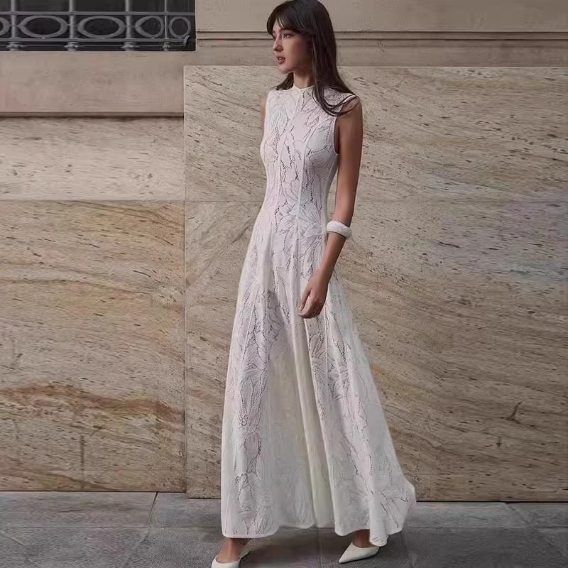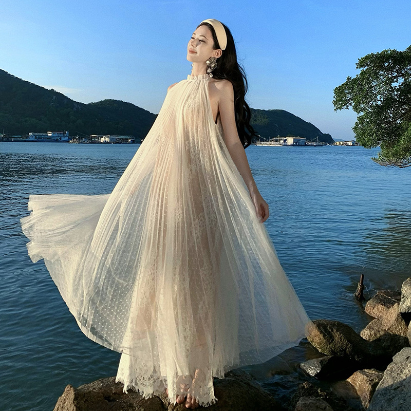 2025新款法式蕾丝挂脖密褶吊带无袖连衣超仙裙度假长裙