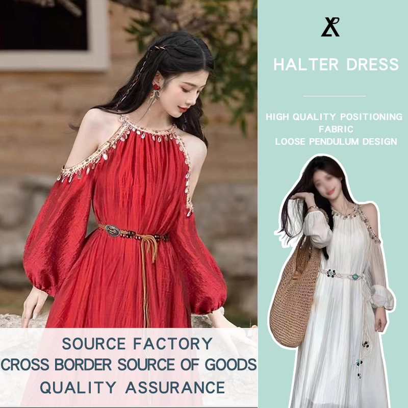 Pabrik Penjualan Langsung Gaun Merah Bahu Terbuka Rok Panjang Liburan Teh Bohemian Gratis Sabuk Pasokan Barang Tersedia