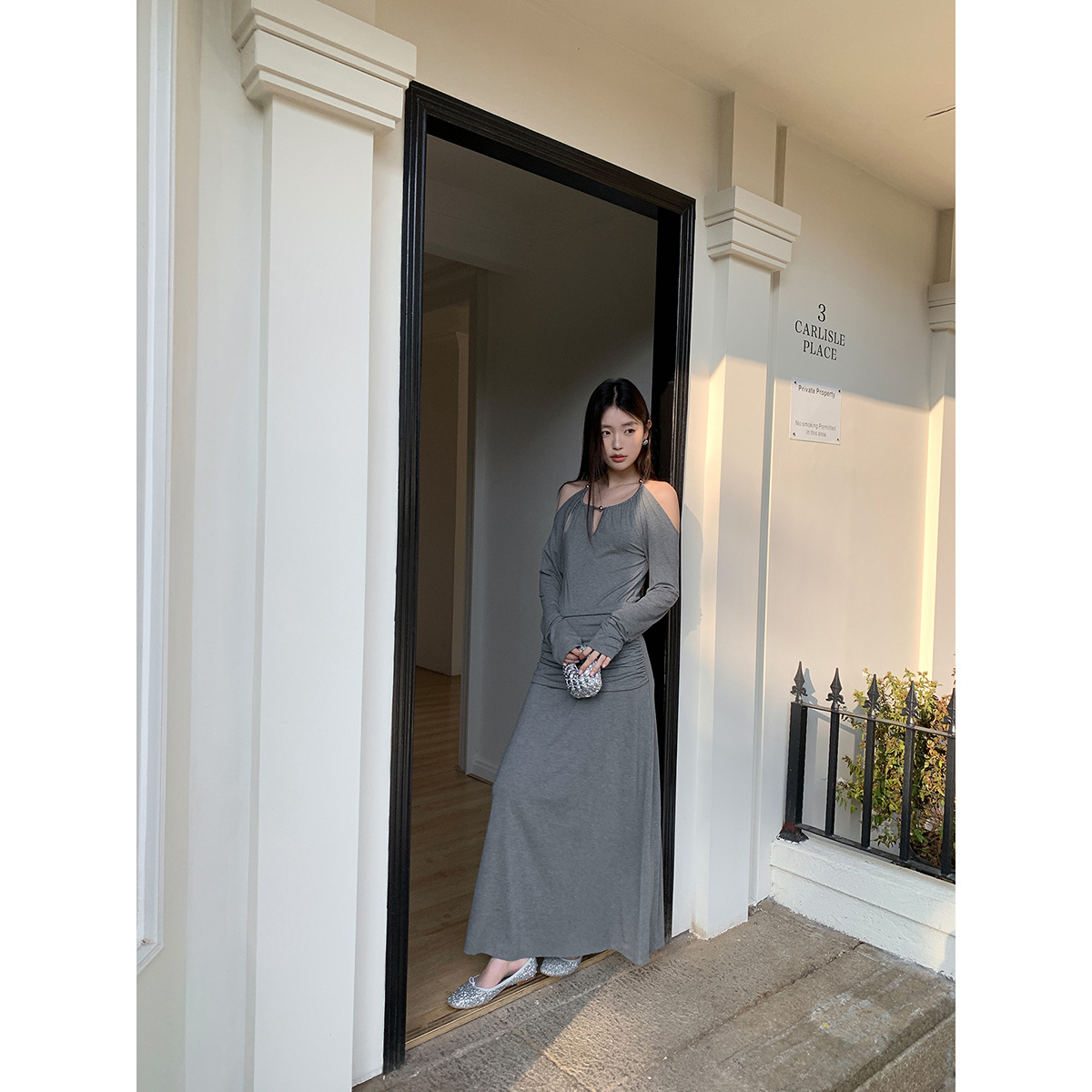 【十三行特价五折不退换】褶皱挂脖长袖连衣裙修身露背a字长裙