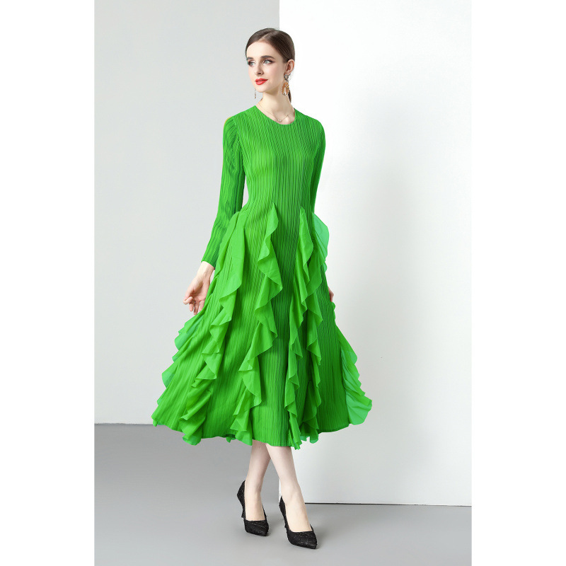 三宅褶皱 2024设计感荷叶边圆领长袖短袖高腰气质显瘦连衣裙外贸