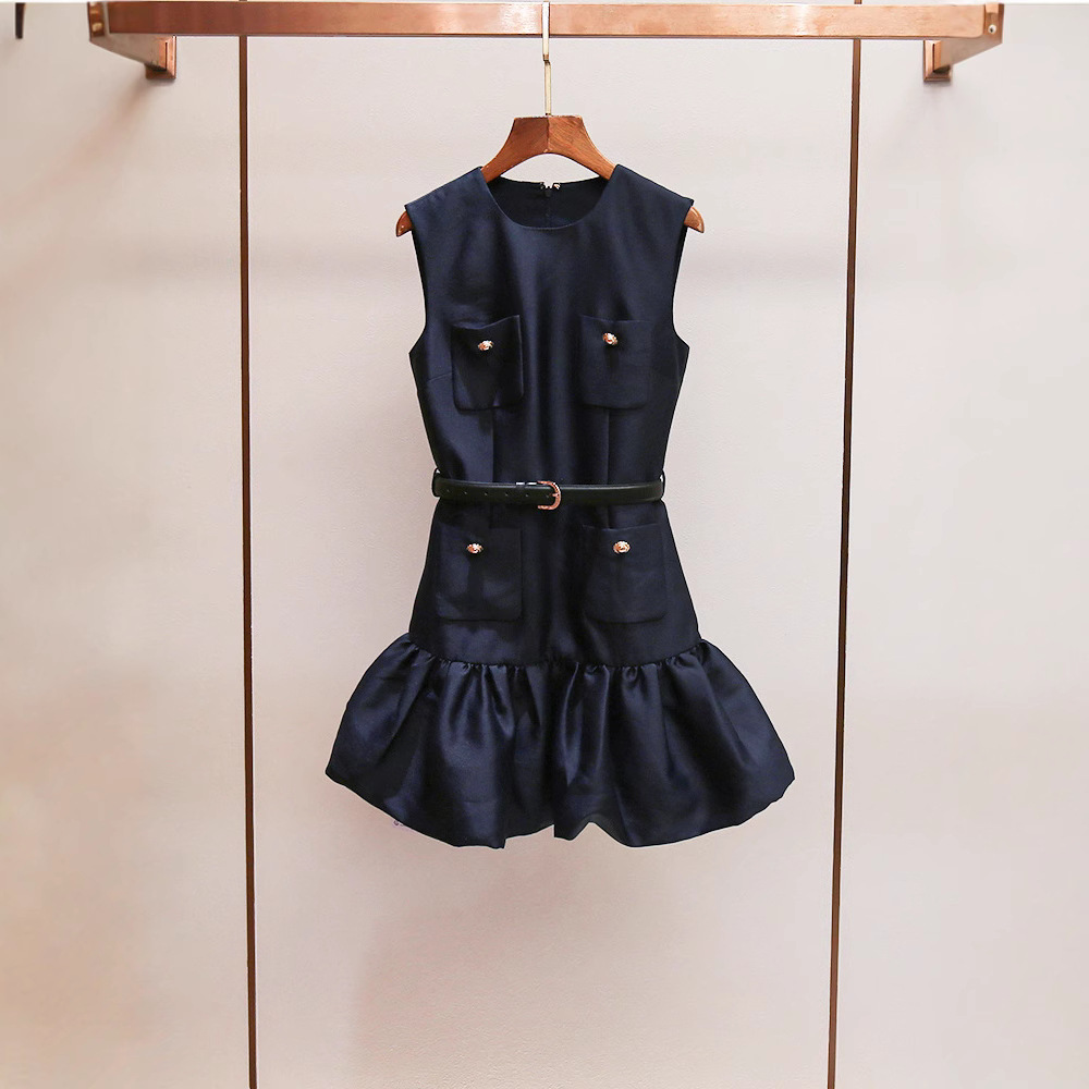 SP Musim Panas Model Baru Seribu Emas Gaya Perancis Gaya Desain Saku Kombinasi Tanpa Lengan Gaun Tank-top Model Pendek