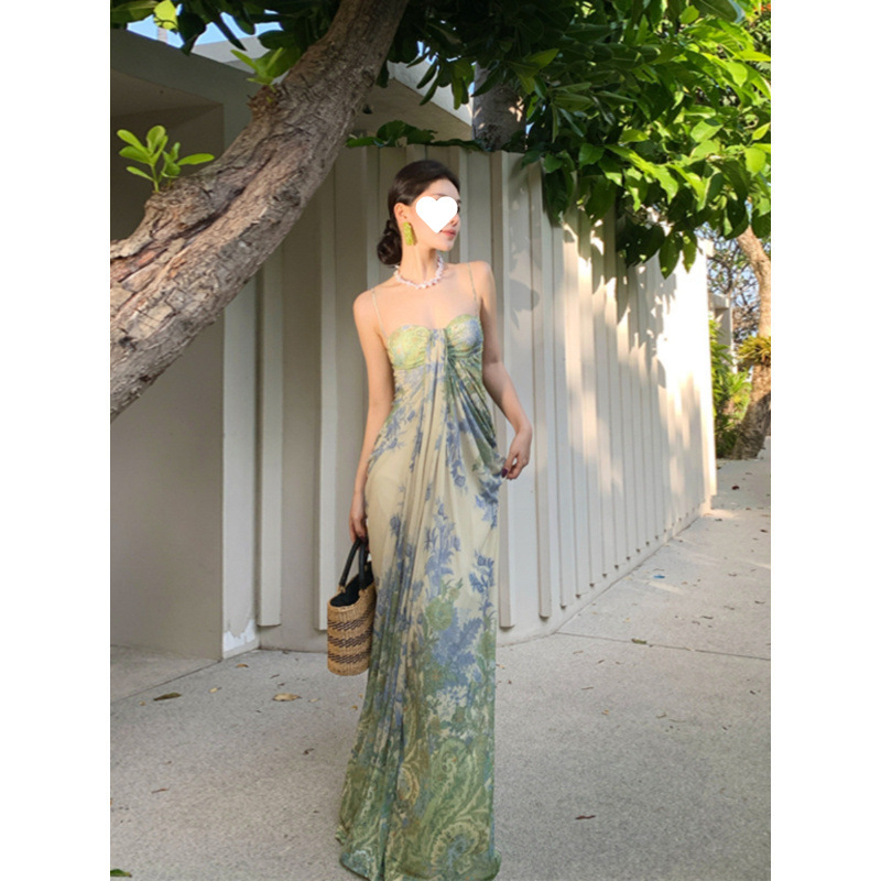 法式绝美吊带长裙海边度假绿色印花连衣裙海岛裙三亚拍照沙滩裙子