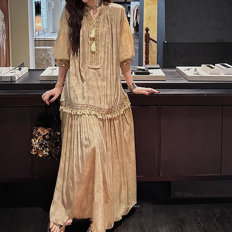 Tersedia【Cangwu】Gaun anyaman gaya etnik dengan tali serut, gaun wanita panjang sedang gaya etnik, musim semi 2025