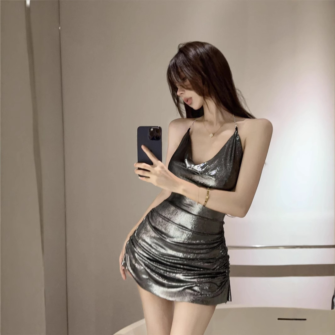 Gaun Seksi Gadis Pedas Gaya Thailand Rok Pendek Bungkus Pinggul Disko Bar Rok Suspender Punggung Terbuka Gaya Desain Lipit Wanita