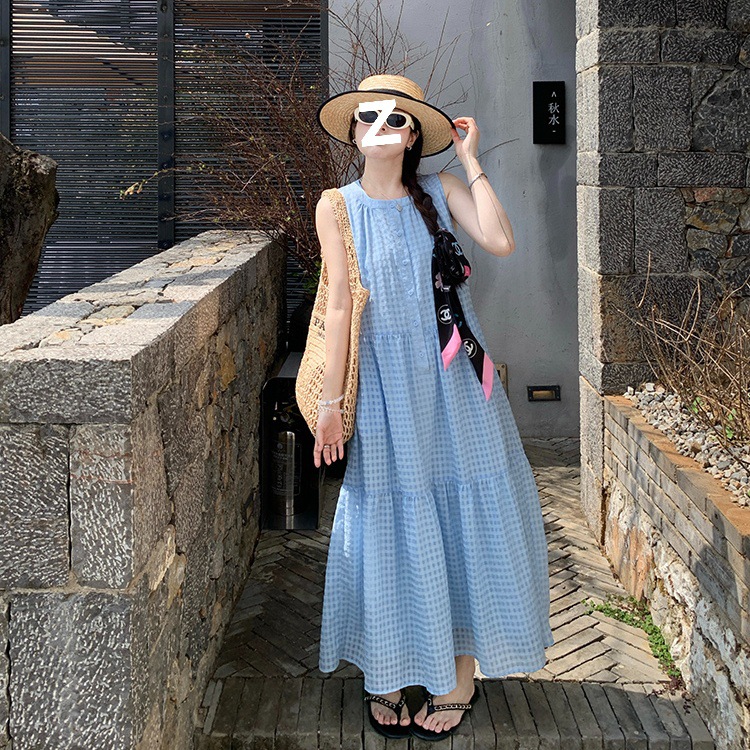 度假风蓝色格子连衣裙女装夏季韩版宽松休闲长款a字无袖背心裙