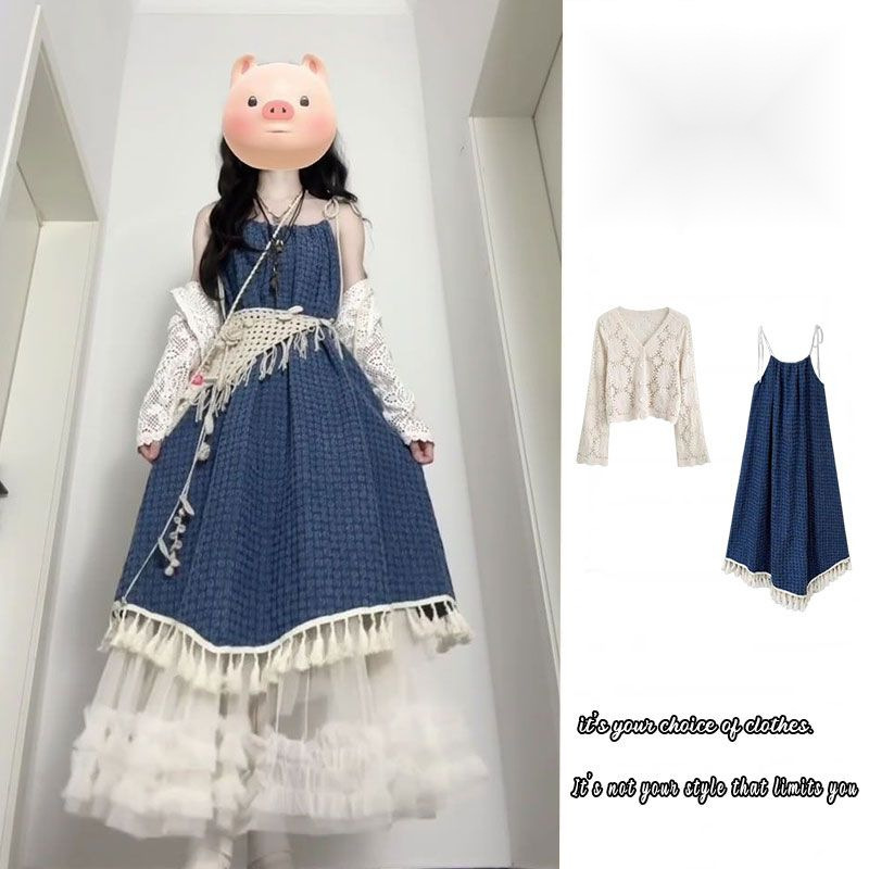 Set Dua Potong Rok Tali Rumbai Mini Retro Gaya Mori Kardigan Pelindung Terik Matahari Mudah Dipadu Padan Pelajar Wanita Musim Panas Model Baru