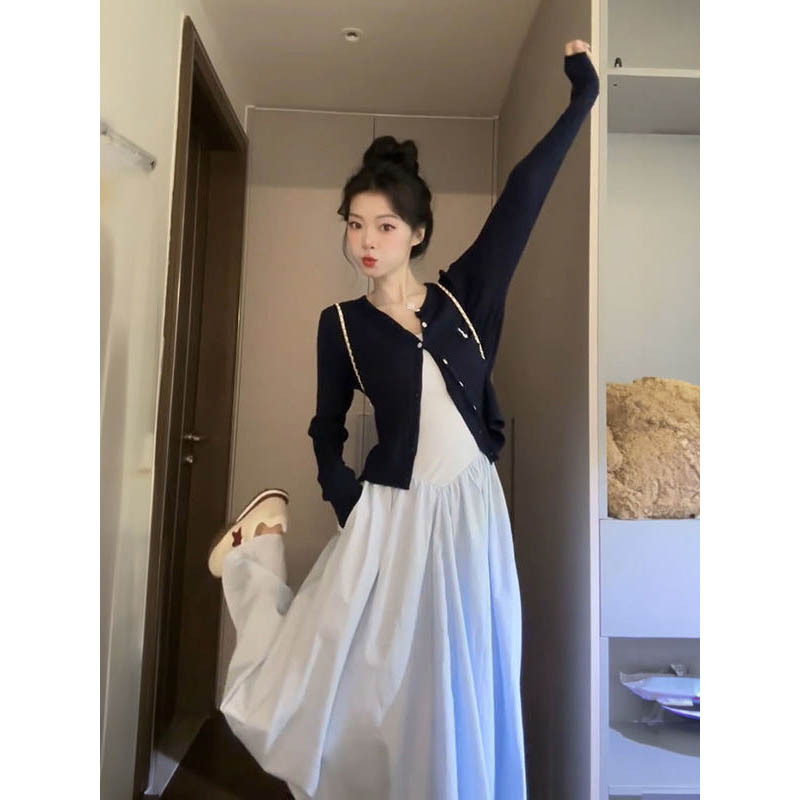Gaun Biru Siswa Perempuan Kardigan Rajutan Warna Biru Tua Gaya Sekolahan Manis Gaya Sekolahan Gaya Korea Musim Semi 2025
