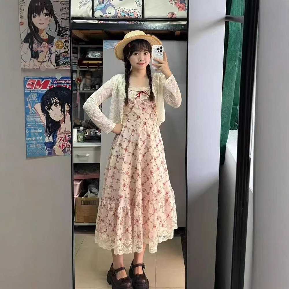 Gaun Bunga Kecil Bertali Sambungan Renda Gaya Prancis Lembut Rok A-Line Bentuk Pir Pinggang Ketat Gaya Korea Pelajar Perempuan