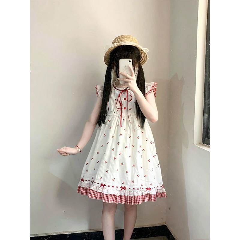 Gaun Terlihat Langsing Longgar Lengan Terbang Bertali Cherry Bertali Bunga Sekolah Anak Kecil Manis dan Lucu dari Departemen Korea