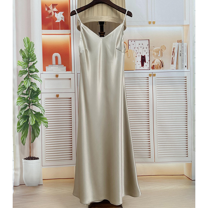 Rok suspender kerah V satin asetat gaun dasar dalam kualitas tinggi tipis musim semi dan musim panas gaun a-line seksi Semua cocok