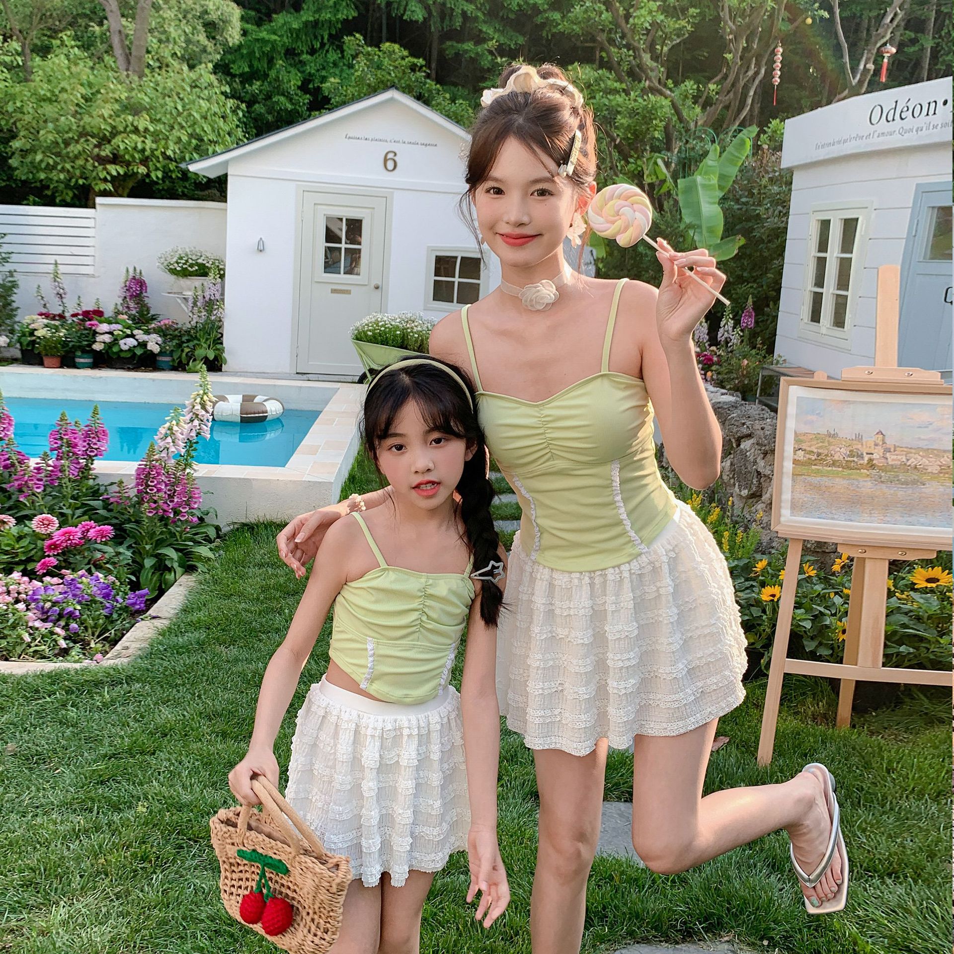 Baju Renang Orangtua-Anak Perempuan Tali Suspender Model Rok Slip-Up Anak Perempuan Sedang dan Besar Pakaian Renang Liburan Sederhana Elegan Anak Sekolah Berendam di Mata Air Panas