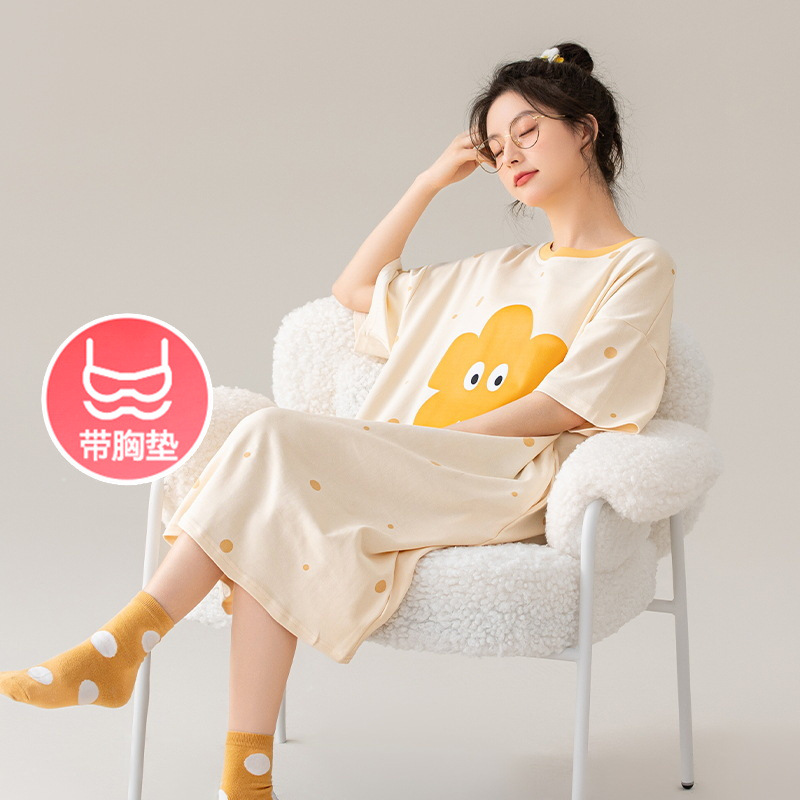 Lashi gaun malam wanita, piyama katun lengan pendek murid muda dengan bantalan dada Musim Panas 2024