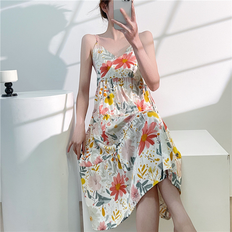 Gaun Tidur Wanita Musim Panas Gaya Putri Jepang Gaun Tidur Tanpa Lengan Sling Siswa Bunga Kecil Manis Pakaian Rumah Tangga Bisa Dipakai di Luar Model Tipis