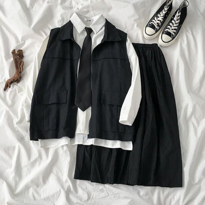 Setelan rompi wanita rok berlipat, overall rompi lengan pendek untuk taman kanak-kanak siswa kuliah