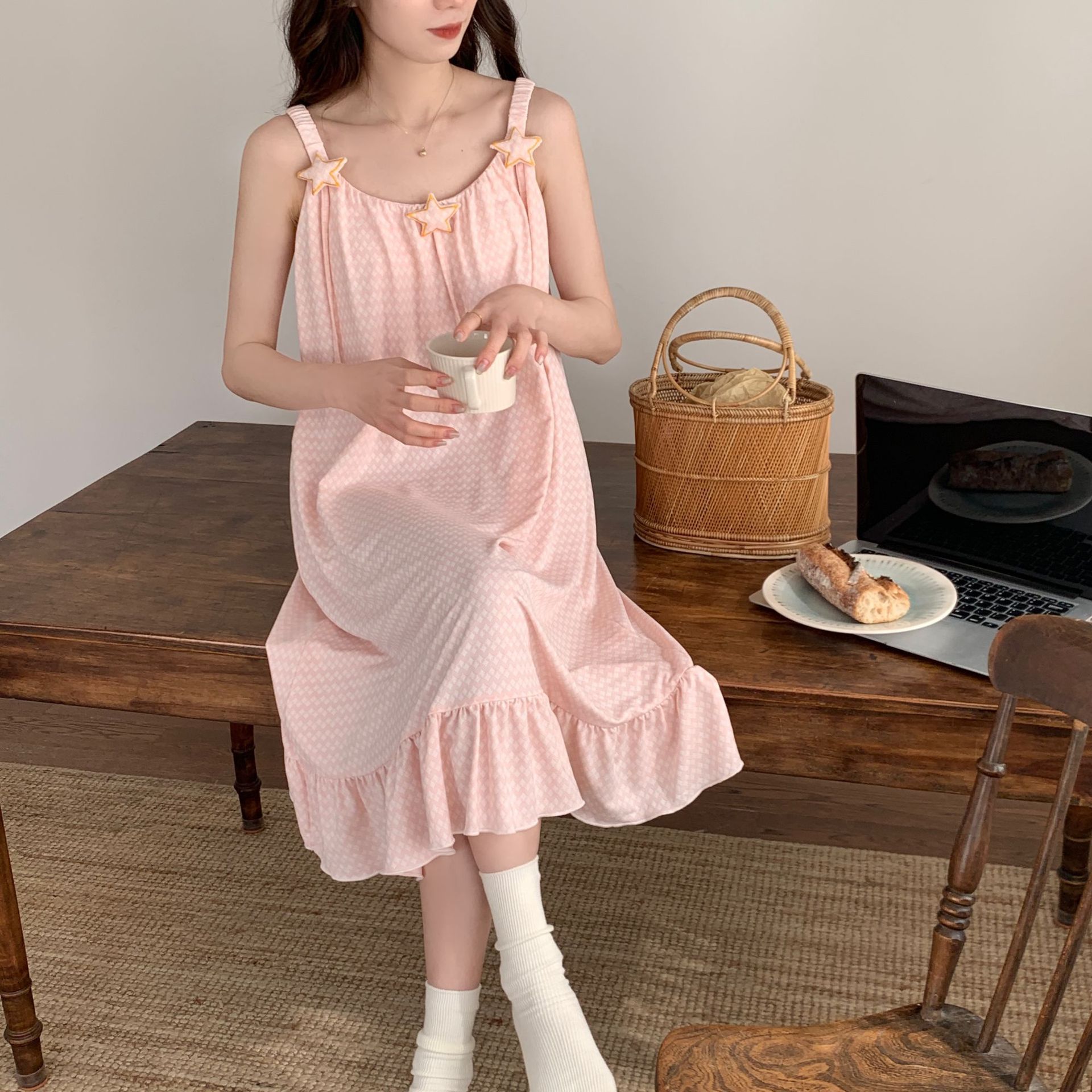 Baju Tidur Katun Murni Rok Tidur Tali Musim Panas Wanita Rok Katun Murni Murid Sekolah Kartun Lintas Batas Lucu Satu Potong Gratis Ongkir