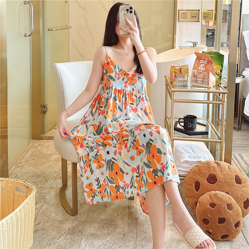 Rok Tidur Bertali Model Baru Piyama Katun Sutra Lucu Seksi Musim Panas Wanita Pakaian Rumah Rok Panjang Katun Sutra Musim Semi dan Musim Gugur Pelajar Manis
