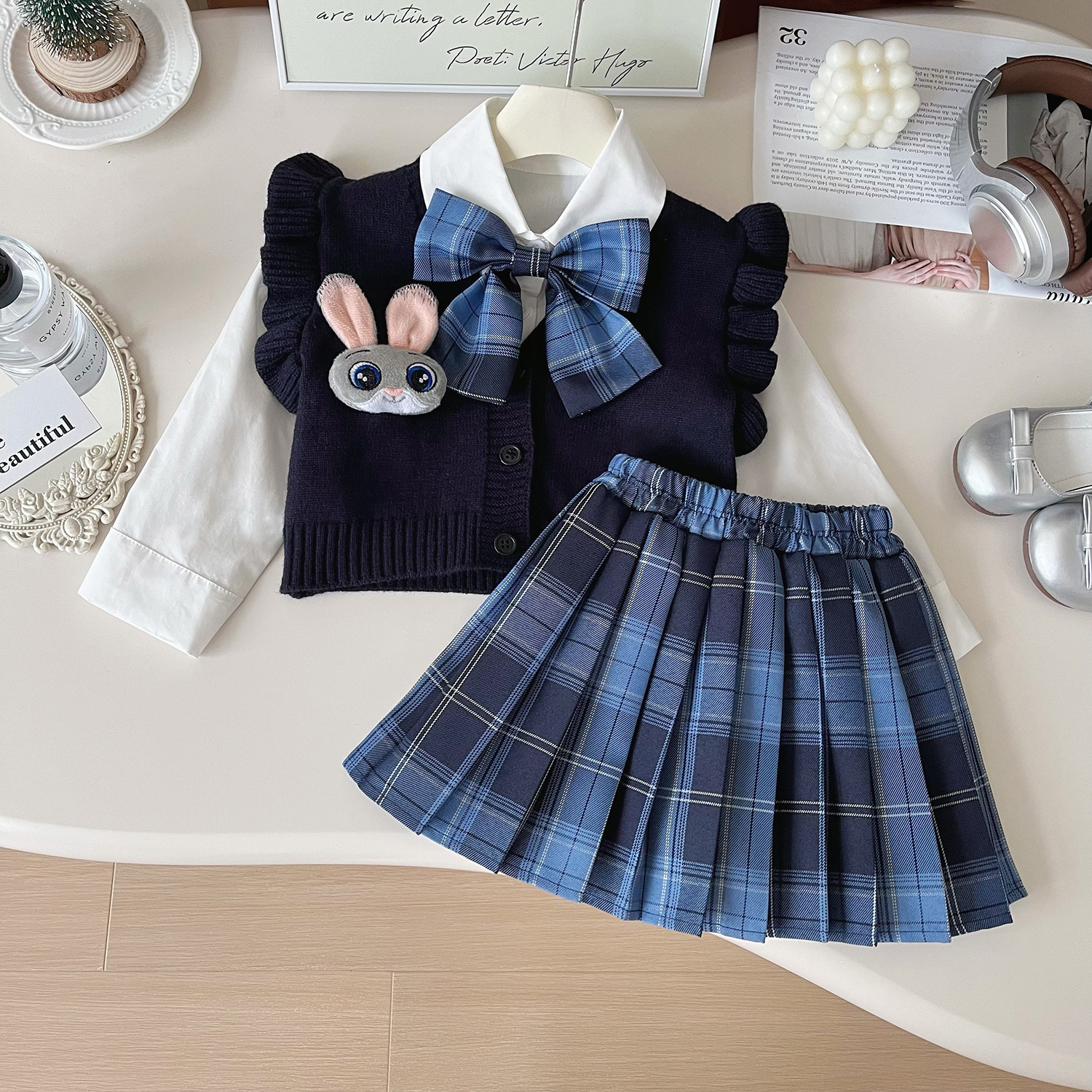 女童套装2024年秋季兔子警官针织马甲+JK裙+衬衫学院风针织三件套