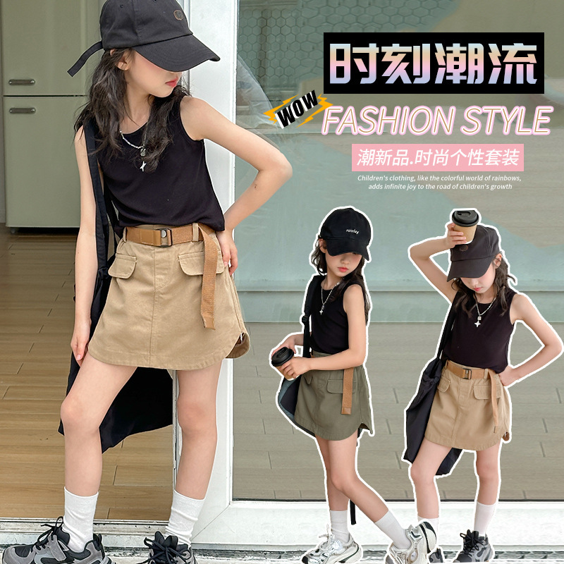 女童背心套装夏装中大童潮酷卡其个性裙子学生a字裙短裙小背心T恤