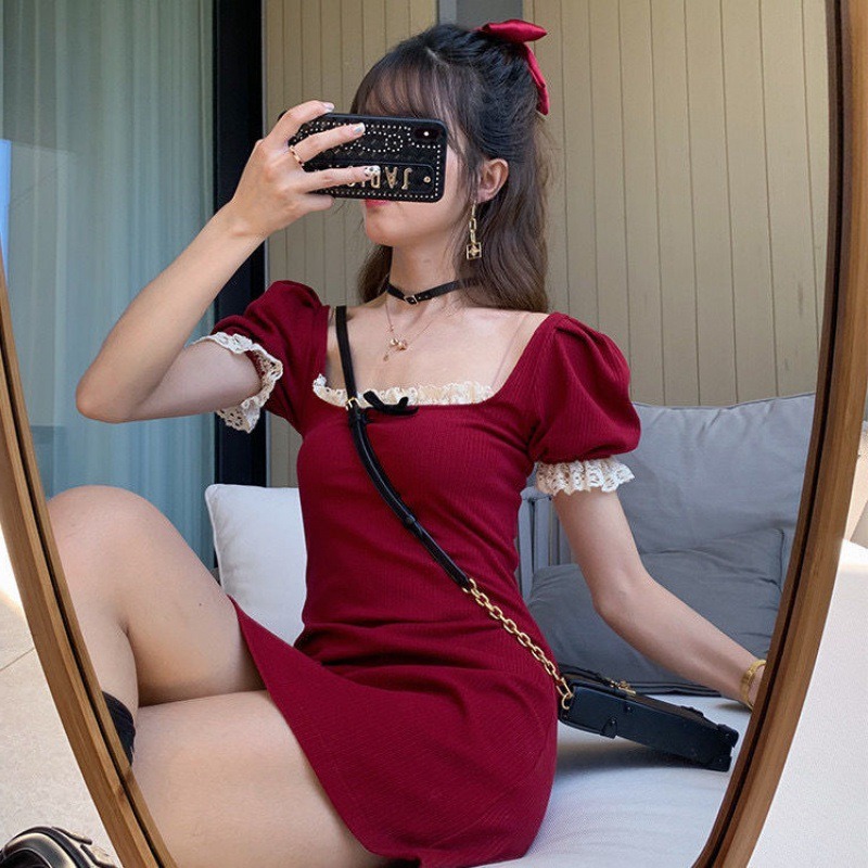 Gaun elegan Musim Panas 2024 untuk wanita, gaun selempang rajut tepi renda kerah persegi ramping pinggang Retro untuk pelajar perempuan