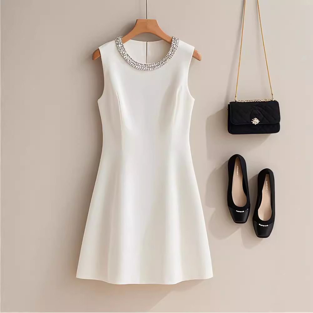 Gaun Rompi Tanpa Lengan Warna Putih Sentuhan Kelas Atas Gaya Perancis Pakaian Musim Panas Model Baru 2024 Rok Elegan untuk Acara Resmi