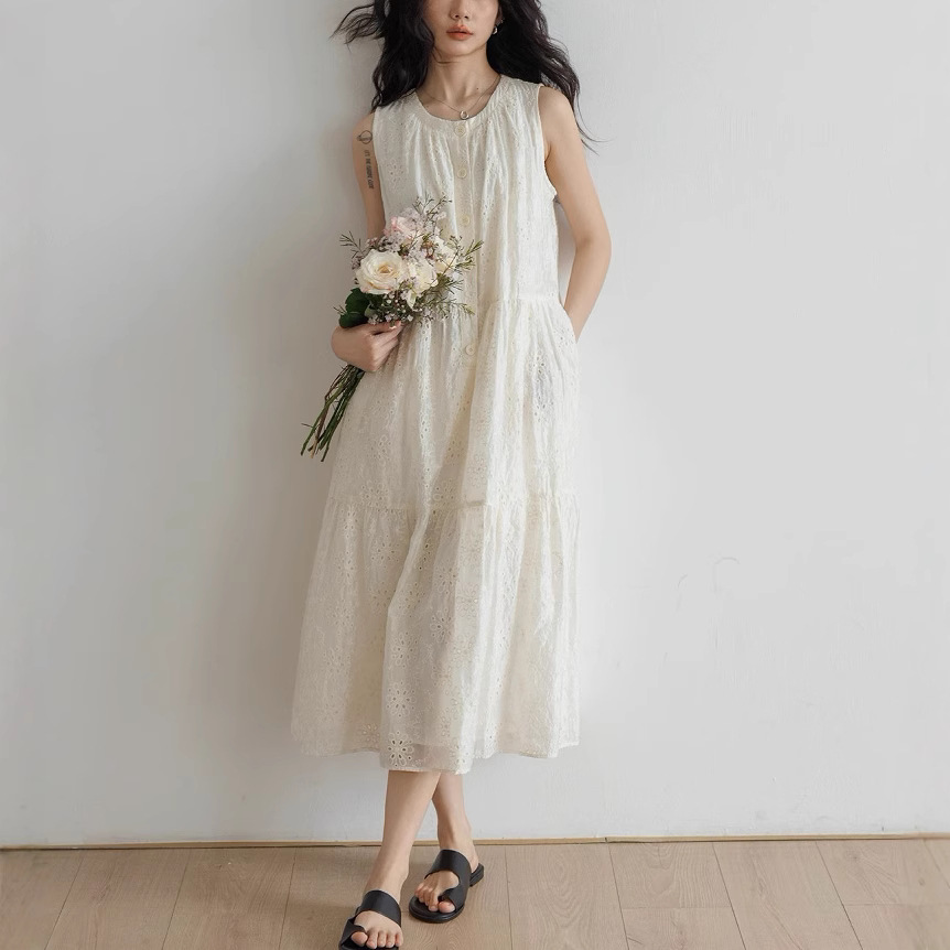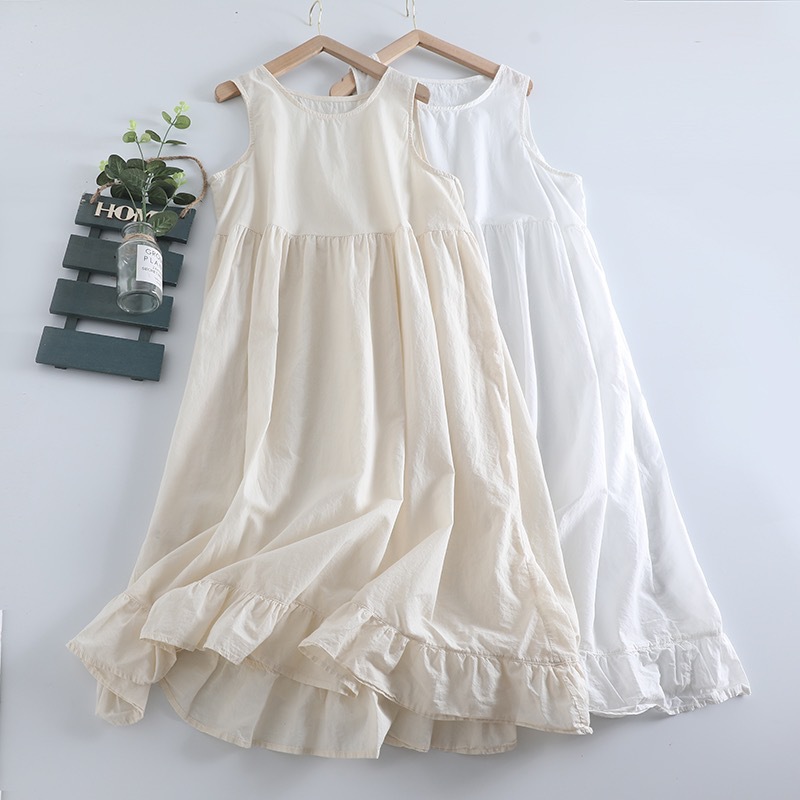 Gaun rompi tanpa lengan tipis segar wanita, gaun pullover leher bulat jahitan renda Mori longgar netral gaya baru
