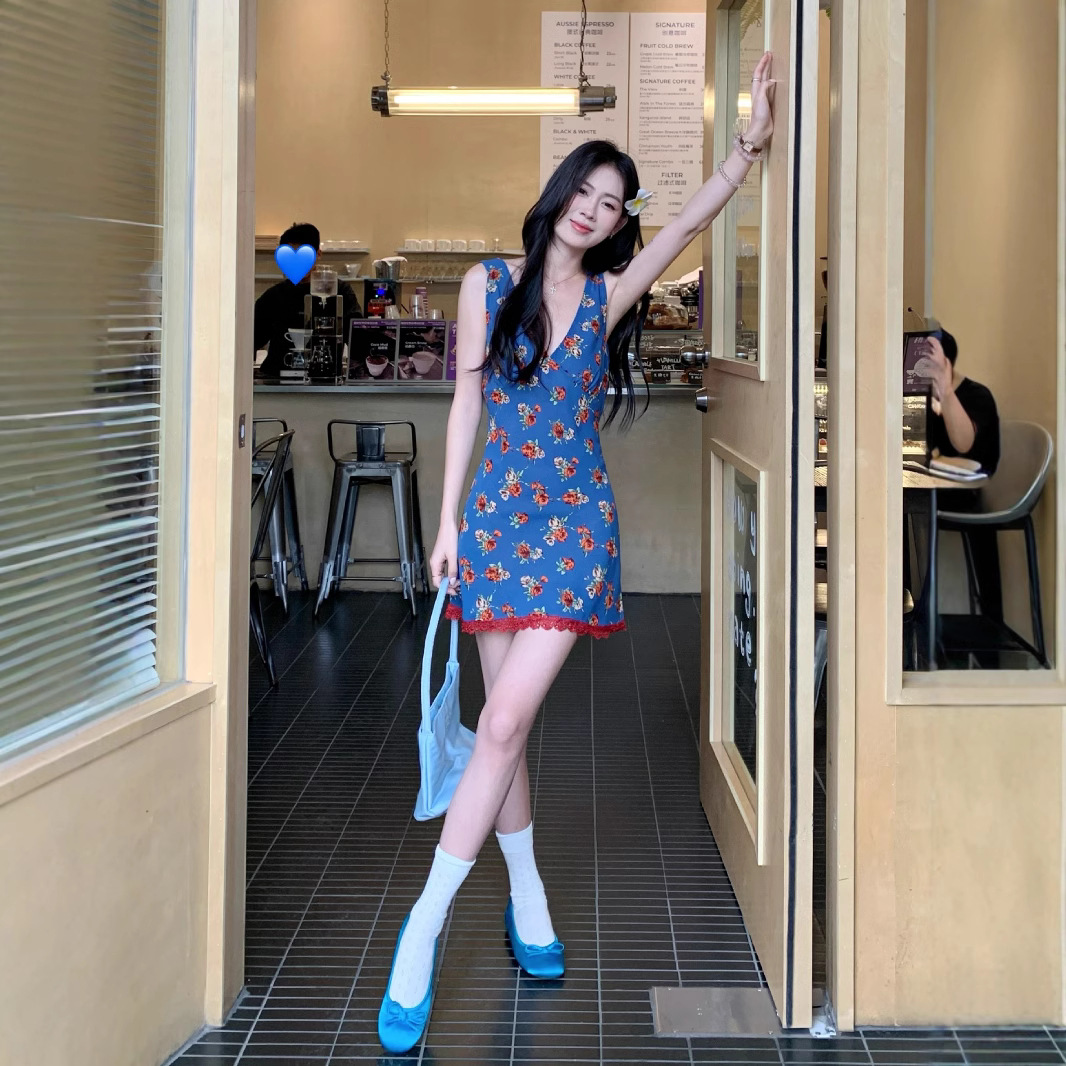 Gaun Kamisol Unik Kelas Atas Elegan Renda Bunga Berbunga Retro Gaya Prancis Rok Malas Santai Bergaya Liburan Wanita