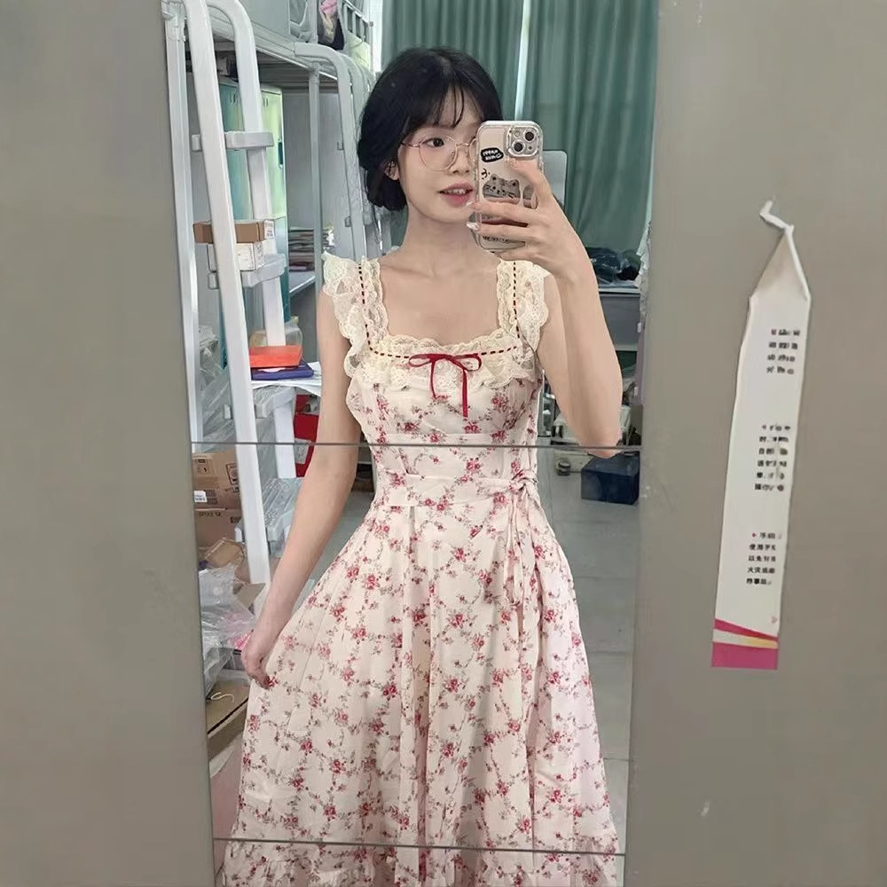 Gaun Bunga Kecil Super Peri Jahitan Renda Kerah Persegi Manis Gaya Prancis Rok Huruf A Terlihat Langsing Pelangsing Pinggang Murid Musim Panas Wanita