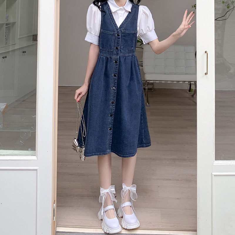 CSM gaun panjang atas lutut, baju kemeja longgar kasual siswa, kemeja bottoming ramping, Rok boneka fashion