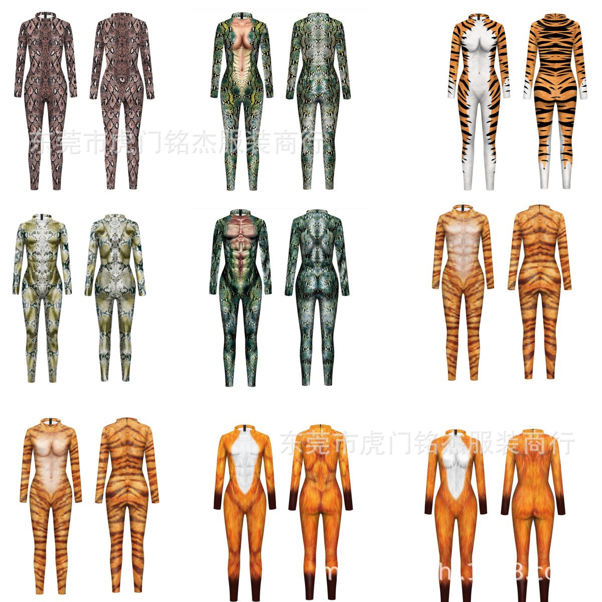 Pakaian penampilan panggung jumpsuit cetak 3D COS pola ular hewan Eropa dan Amerika pakaian pasangan setelan satu potong lengan panjang