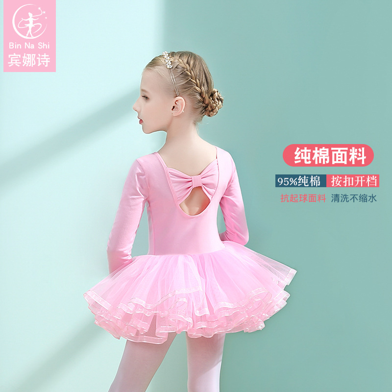 Pakaian tari anak-anak dari katun murni untuk musim gugur dan musim dingin, rok balet untuk anak perempuan, pakaian latihan untuk gadis kecil, rok tari Cina berwarna merah muda dengan lengan panjang dari kain kasa.