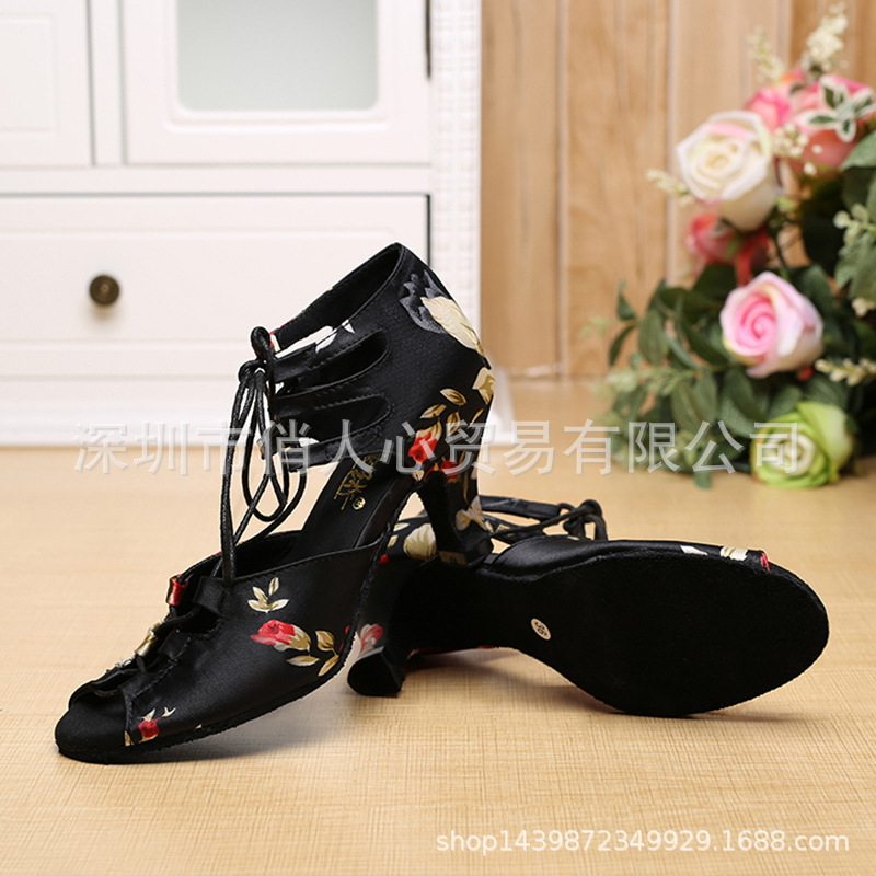 Sepatu dansa profesional dewasa wanita, sepatu dansa Latin cetak modis, sepatu dansa profesional bawah lembut, sepatu dansa hak sedang musim panas