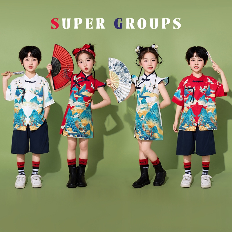 Pakaian paduan suara anak perempuan, pakaian olahraga anak SD sekolah dasar cheongsam, pakaian kinerja anak laki-laki