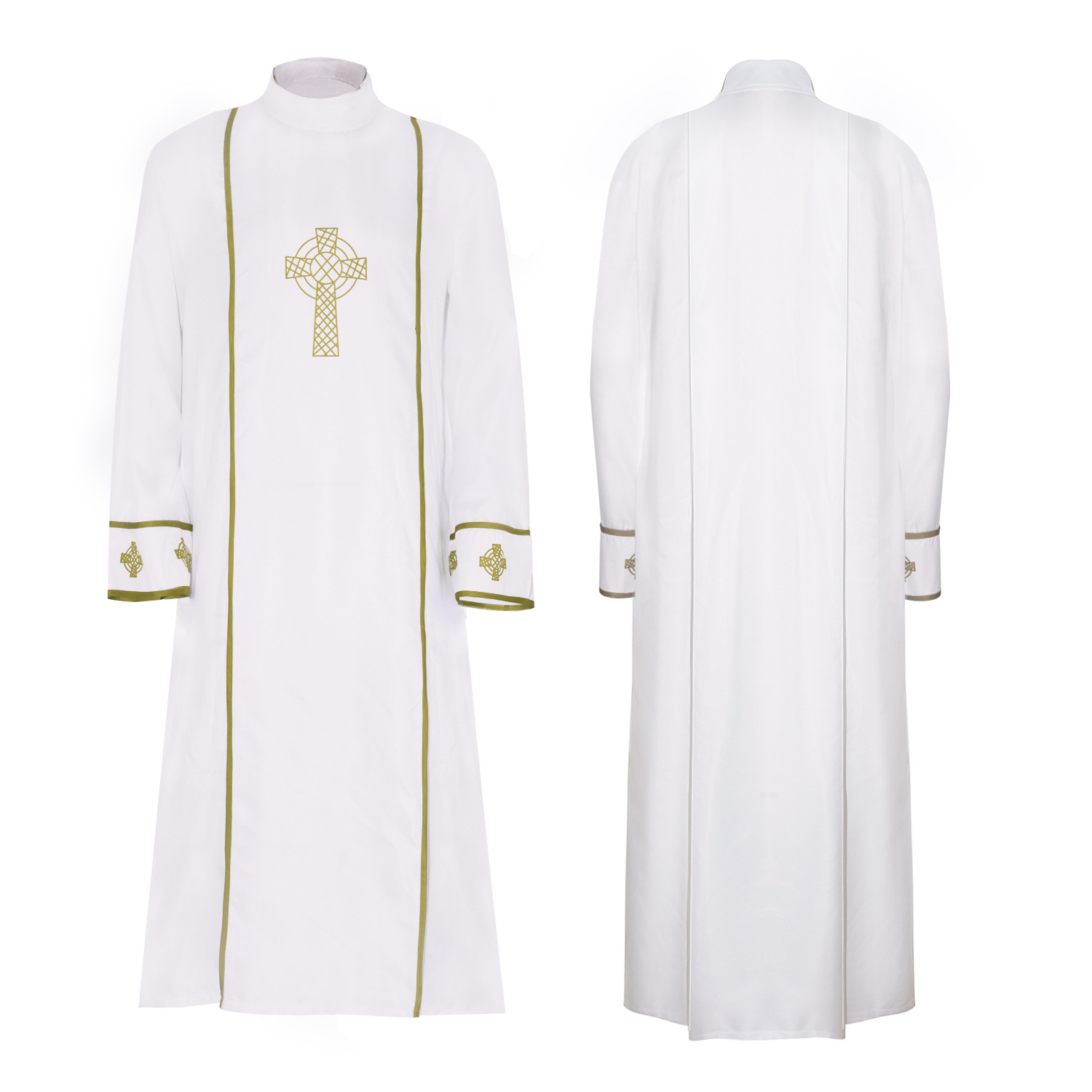 Gaun cospaly kostum pendeta putih, kostum cos penampilan panggung, jubah silang kuning abad pertengahan