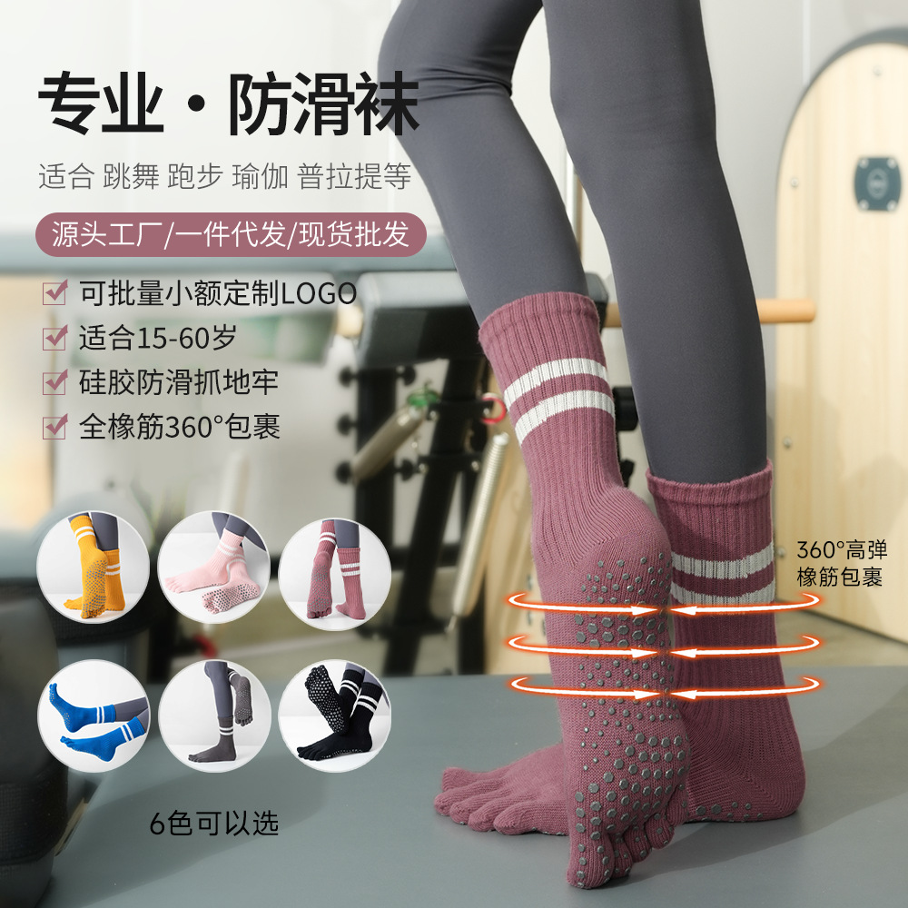 秋冬加厚点胶防滑瑜伽袜女中筒双条五指袜专业运动舞蹈普拉提袜