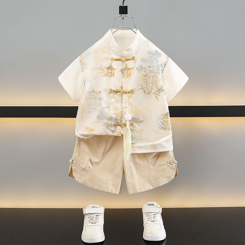 Pakaian Han Setelan Gaya Tiongkok Baru Anak Laki-Laki Musim Panas Gaya Cina Pakaian Tang Lengan Pendek Anak Model Tipis Kemeja Gaya antik Pakaian Pertunjukan