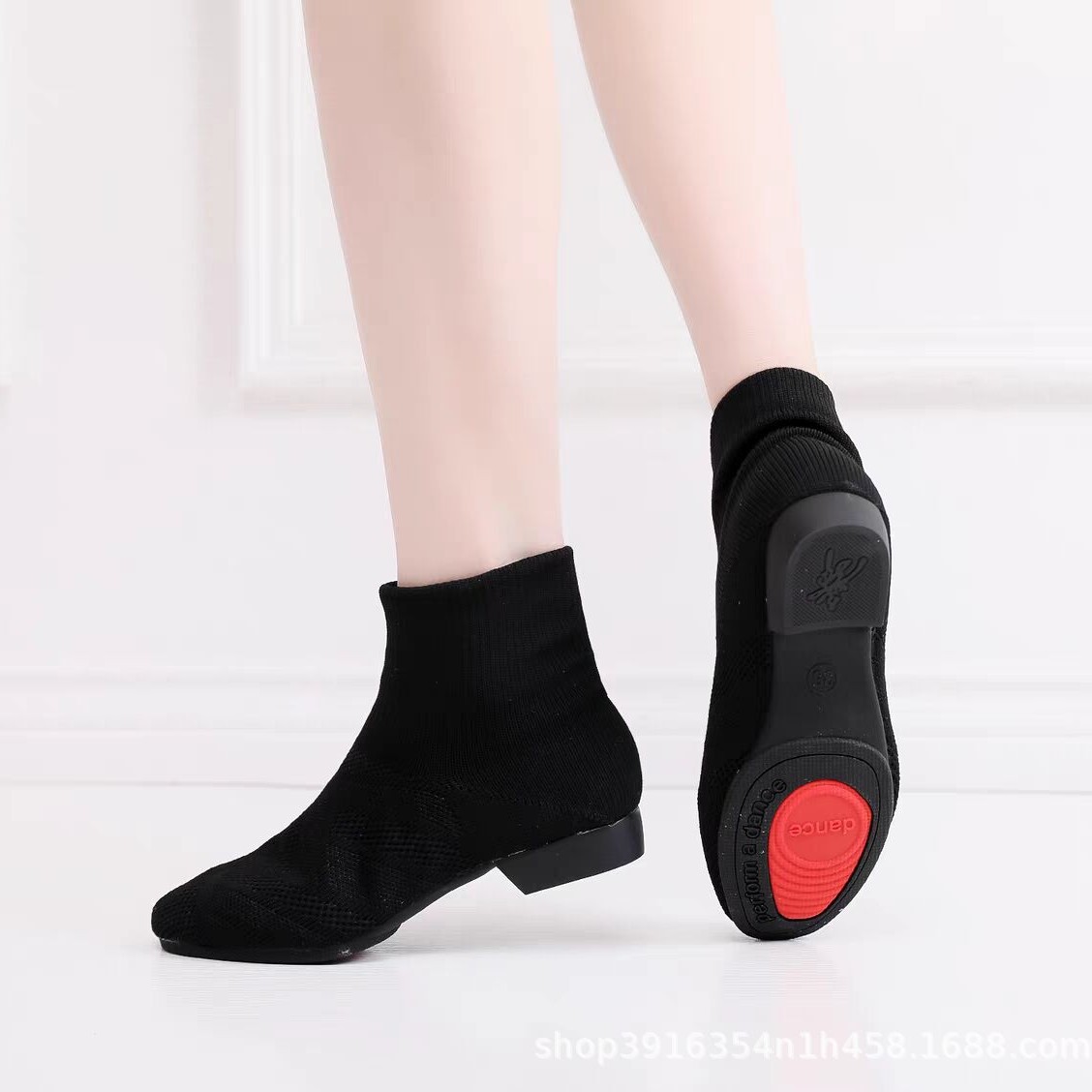 高帮爵士 舞鞋女成人教师专业舞蹈鞋软底带跟现代舞鞋飞织网面黑