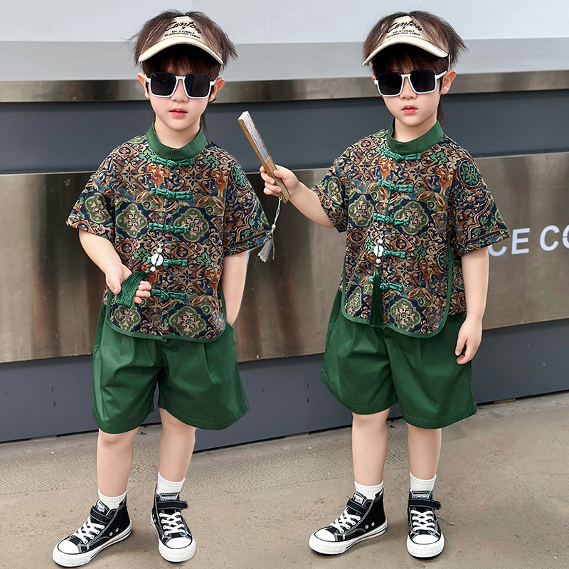 Pakaian Han Anak Laki-laki Pakaian Pertunjukan Lengan Pendek Musim Panas Pakaian Taman Kanak-kanak Pakaian Nasional Model Cina Musim Panas Set Baru Gaya Cina