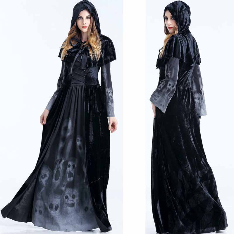 Stok tersedia kostum penyihir cetak tengkorak baru penyihir hantu Ratu kostum horor penyihir