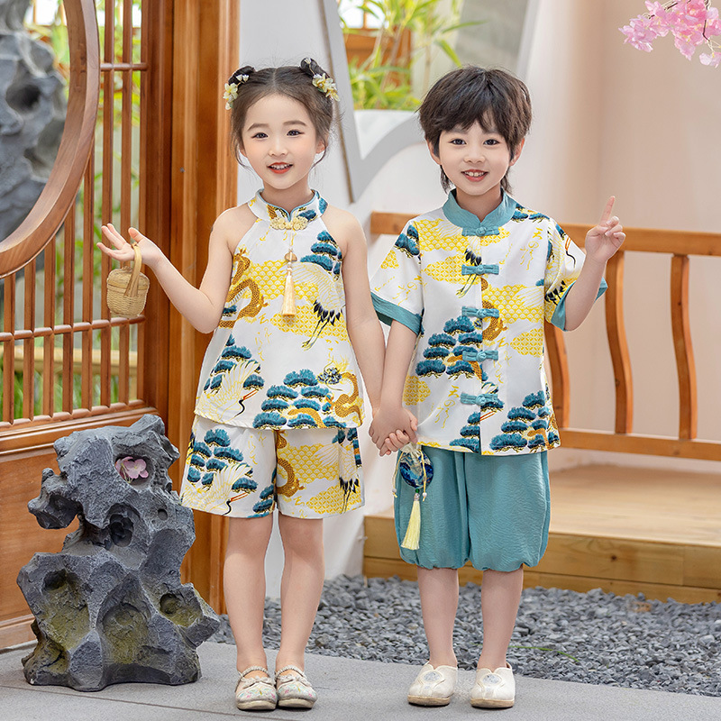 Pakaian Tang Gaya Barat Modis Gaya Cina Anak Laki-laki dan Perempuan Musim Panas Produk Baru Gaya Kuno Yunzhong Naga Gaya Kuno Cina Pakaian Pertunjukan