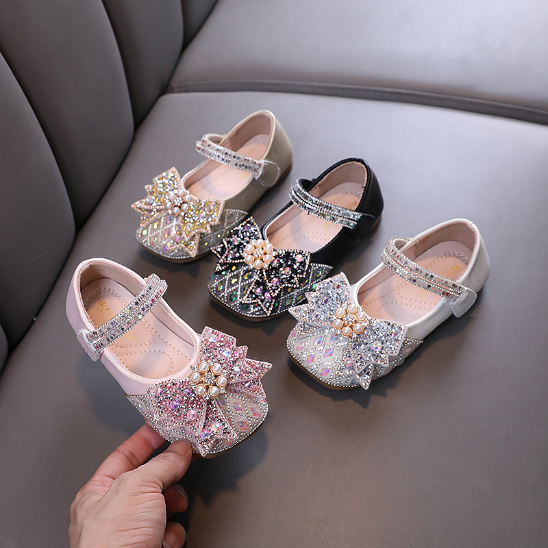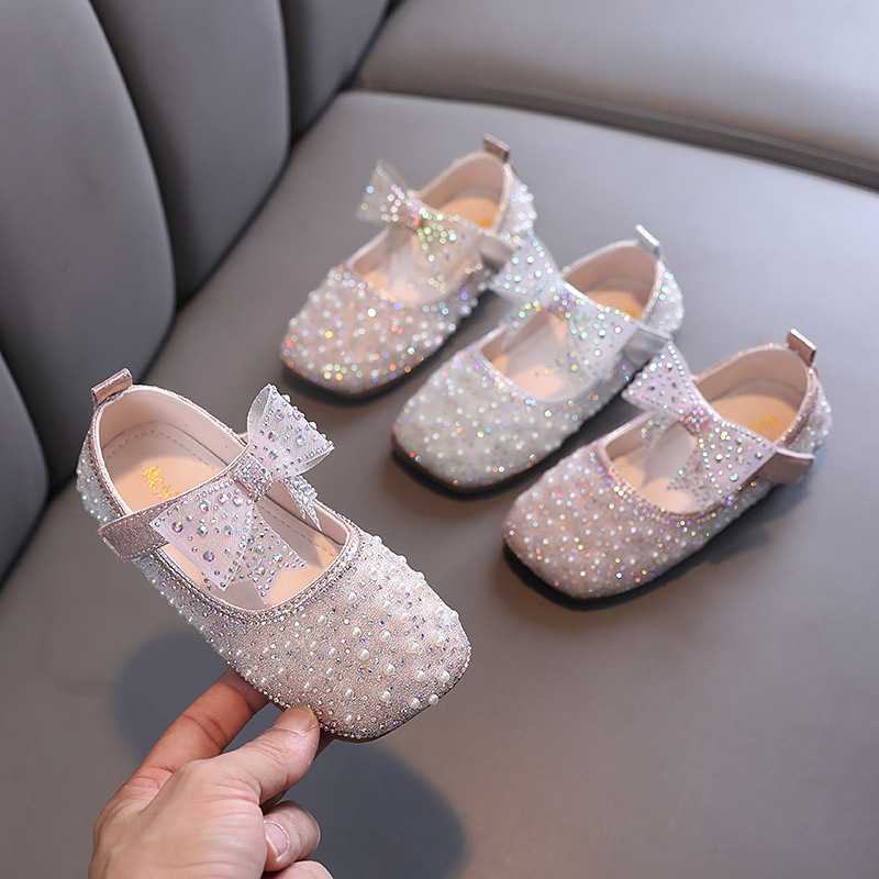 2024 musim semi dan musim panas gaya Korea gadis kecil sedang dan besar anak-anak tertutup berlian imitasi putri sepatu dansa kinerja kupu-kupu mutiara