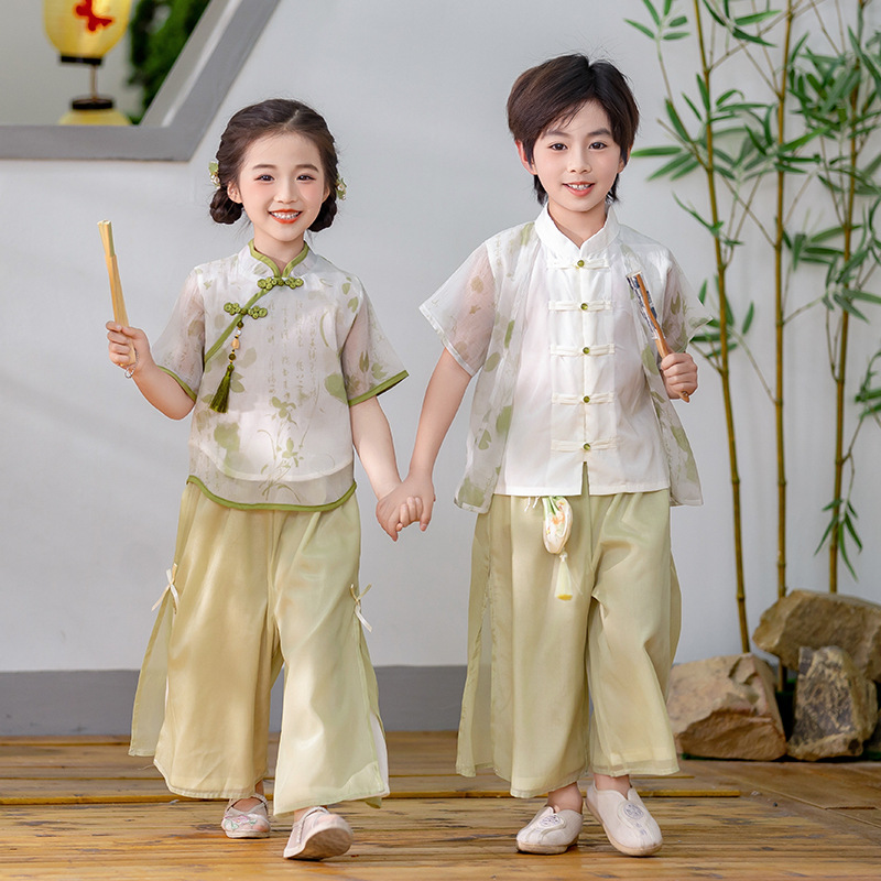 Pakaian Anak-anak Pakaian Han Gaya Cina Musim Semi dan Musim Panas Pakaian Pertunjukan Sama Pria dan Wanita Atasan Ditambah Celana Pakaian Pertunjukan Enam Puluh Satu Set Rambut